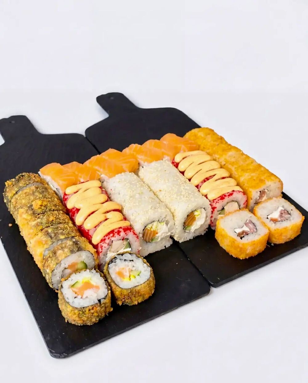 1. Лосось, рис, сыр 2. Масага, сыр, огурец, курица, Спайси, рис 3. Кунжут, рис, сыр, салат, огурец, лосось 4. Рис, сыр, помидор, бекон 5. Рис, лосось, огурец, салат